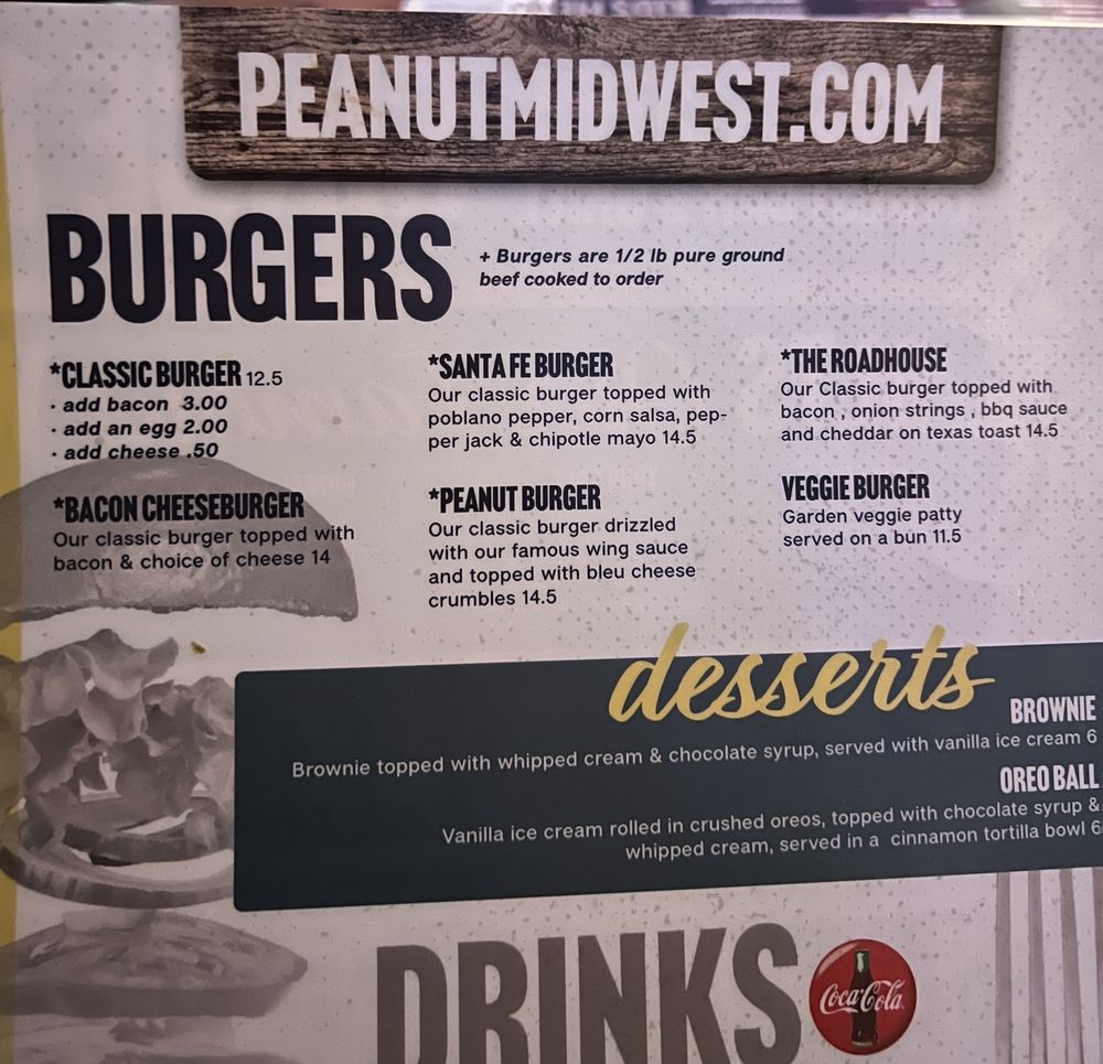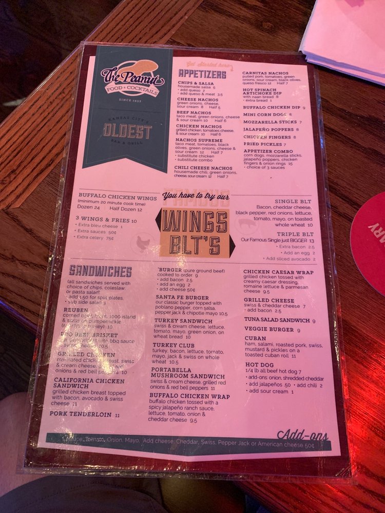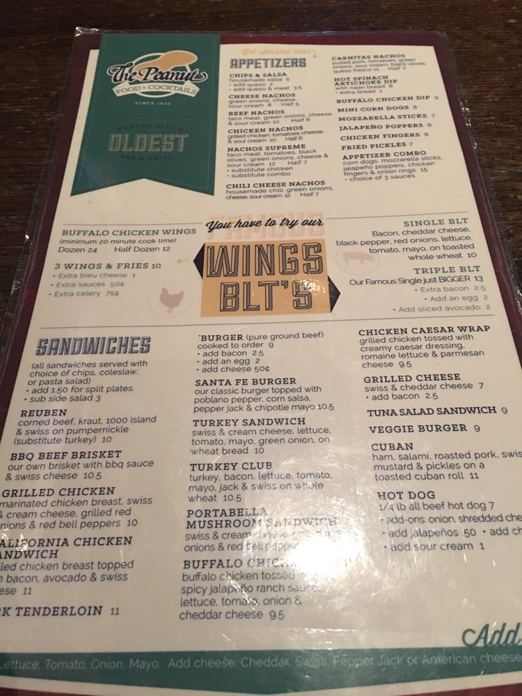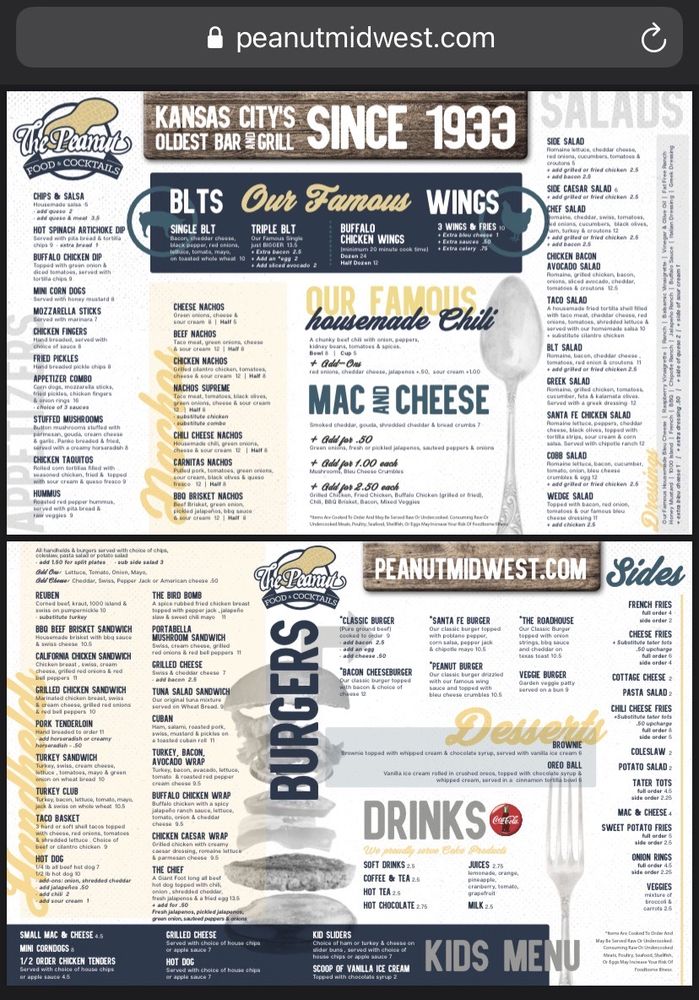 Introducing the menu at The Peanut, a popular sports bar in Overland Park, Kansas. This casual dining spot offers a variety of American dishes with a focus on salads. The menu features mouthwatering appetizers like housemade Chips & Salsa, loaded Nachos with options for beef or chicken, perfect for sharing with friends. The restaurant is packed with amenities such as outdoor seating, a full bar, TV screens, and even a pool table for entertainment. The Peanut is a great spot for families, with options catering to kids and a laid-back atmosphere for all. With convenient takeout and delivery services available, it's easy to enjoy their delicious food from the comfort of your own home. Don't miss out on the best nights to visit - Thursday, Friday, and Saturday, for a fun and vibrant dining experience at The Peanut.
